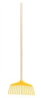Lövräfsa i plast med trähandtag 80 cm hög.