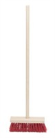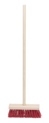 Kvast med röda borst och trähandtag 77 cm hög.